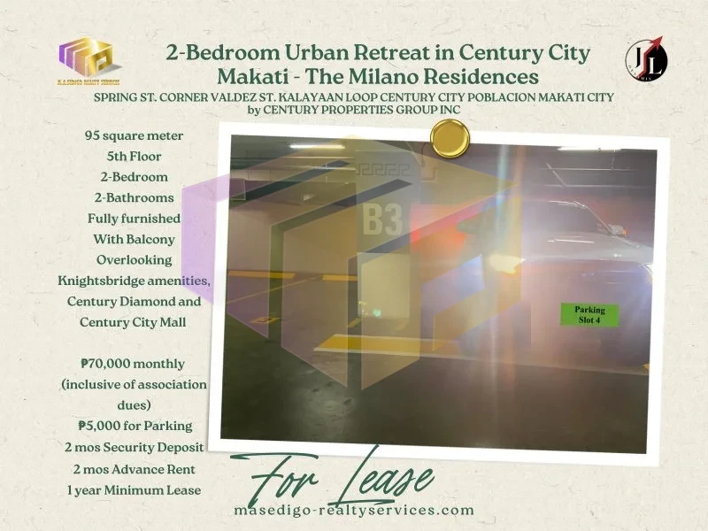 Available for lease at PHP 70,000 per month with a minimum one-year commitment, this residence ensures convenience with a dedicated parking slot in Basement 3 for an additional PHP 5,000 monthly. Starting from February 20, 2025, step into a life of privilege as The Milano Residences also provides top-tier amenities including 24/7 security, a concierge service, a state-of-the-art gym, swimming pool, function rooms, and more.