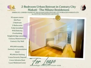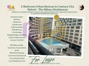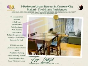 Nestled in the vibrant neighborhood of Poblacion in Makati, this exquisite 2-bedroom, fully furnished unit at The Milano Residences offers a seamless blend of comfort and luxury. With a generous floor space of 95 sqm and a strategic location that affords stunning views of the Century City Mall and the Century Diamond, this property is your gateway to an upscale lifestyle.